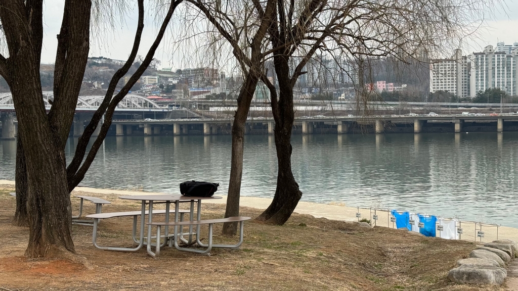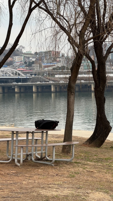 한강 보면서 아이디어도 떠올리면서.. 여기 앉는 자리 잘 되어 있거든요.. 그리고 이제.. 조금 더 앉아있다가.. 다시.. 집으로 가기 위해..