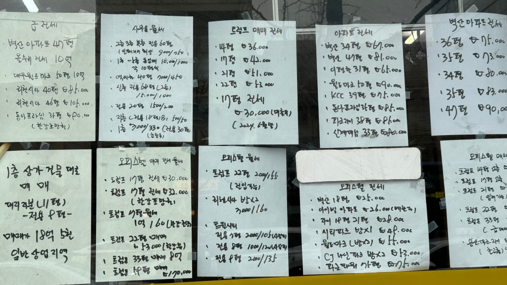 위의 가격 붙여 놓은 종이들을 보시면용 어느 부동산의 쇼윈도 인데용 그런데.. 정중앙의 상단에 트럼프 매매 전세 나와있잖아여.. 용산 트럼프 타워가 참 좋긴 해요.. 위치도 그렇고 층고도 그렇고.. 저기가.. 한강에서 불꽃놀이 하면 바로 보이거든요.. 전에 말씀 드린 적 있는데.. 튼튼하게 지었다던데.. 층고도 높고.. 미국식이라.. 보니까.. 가격이.. 좌측 하단에.. 맨 좌측 그 옆에.. 오피스텔 전세 월세 적혀있는 종이 보시면용 맨 밑에 트럼프 59평형 매매 17억이라고 적혀있는데.. 가격이 내려갔더라고용 부동산 경기 좋을 때 몇 평형이더라 50초반이었나.. 여튼.. 동급은 아니고 살짝 낮은 평수였는데 18억이었거든요.. 지금은.. 17억으로.. 그리고.. 33평형 매매가 8억이에요.. 와.. 가격이 점점 낮아지긴 해용 우아.. 아잉 우리주인님 사랑해용 사랑해용!! 굽신굽신 굽신굽신..