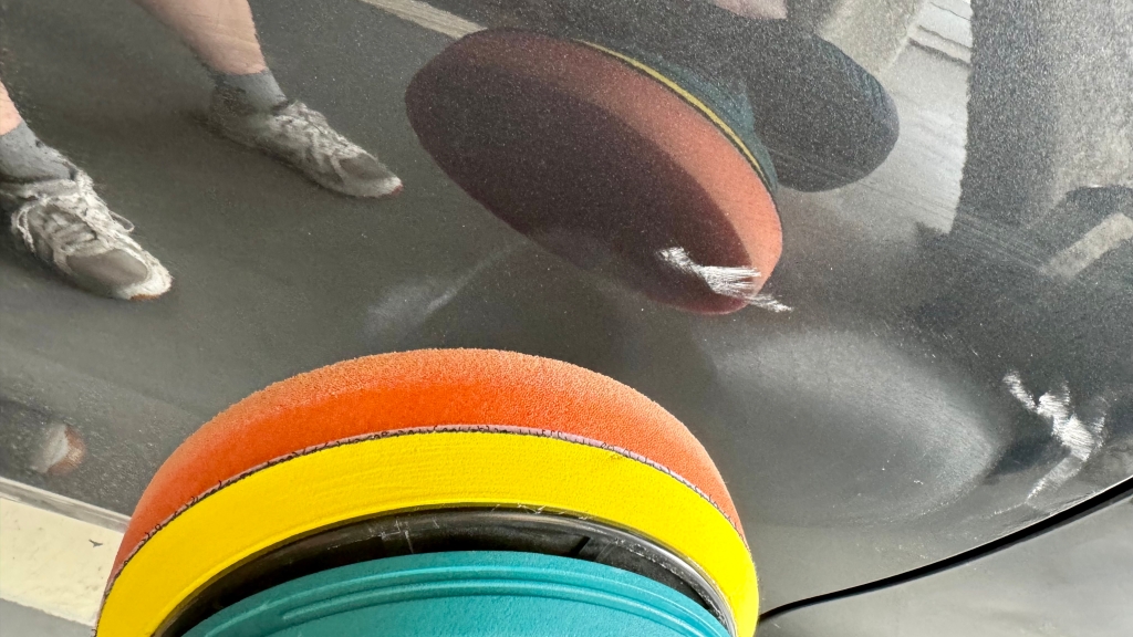 이렇게 기계로 돌려서.. 지금 하얀색은 컴파운드 가루에용 연마제죠.. 와.. 높은 속도로 돌리니까 그제야 지워지는데 대박..