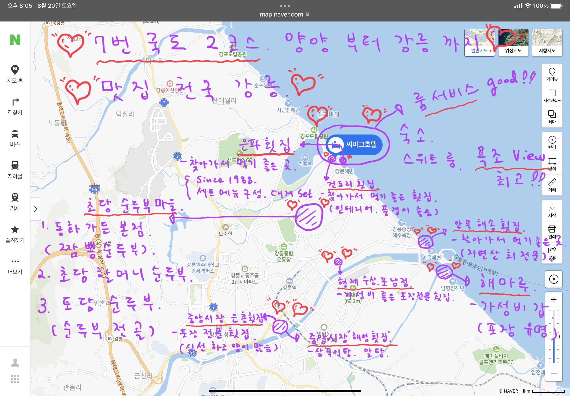 여튼 그런데.. 그 중에서 맛집들은.. 일명 홍보도 잘 하고 하는 그런 관광지 맛집들은 1년 내내 운영을 하시는데.. 예를 들어 강원도의 두부 마을의 큰 식당들이라든지.. 그런데 비수기나.. 평일에 영업 하실 때 그런 곳을 찾으면요.. 되게 좋아요.. 그 넓은 200석 홀에서 우리둘이 앉아서 바다 보면서 둘이 맛있는 식사 하시는 거예요.. 그런데 일단 바닷가 해안가의 맛집 1순위는.. 어떤 곳이냐면용.. 아잉.. 우리둘만 아시자용.. 오퐈가 나중에 다 말씀 드릴 게여.. 사람들이 그런 건 잘 몰라여.. 맛집 피디 분들이나 작가 분들도 모를 걸여.. ㅎㅎㅎㅎ!! ㅎㅎㅎㅎ;