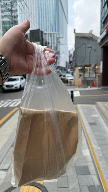 우앙.. 오는 길에.. 충무로에 꽈배기 집이 있기에 꽈배기 3개 2,500원, 일반 핫도그 두 개 2,000원 해서 샀어여 원래는 종이봉투에만 넣어주는데 오퐈는 저 비닐 봉투를 사서 가지고 다녀용.. 다이소에 팔아여 20매에 1,000원.. 왜냐면 있으면 요긴해용 특히 관광을 한 다든지 할 떄 음식 남으면 포장하기도 좋고.. 따로 포장 좀 해주세요 해도 되는데 그냥 조용히 내 음식 내가 알아서 챙길 게 하는 식으로.. 아니면 오퐈는 혼자 호캉스 갔을 때 많이 쓰던 방법이라 일상처럼 느껴지긴 하지만.. 호텔에서 치킨 같은 거 시켜 먹으면요