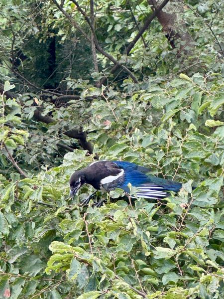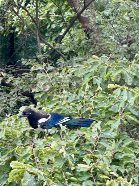 보니까 전에도 본 적이 있는 꼬리 부분이 녹색인 까치가.. 응.. 그래서 “아.. 대왕님..” 하고.. 응..