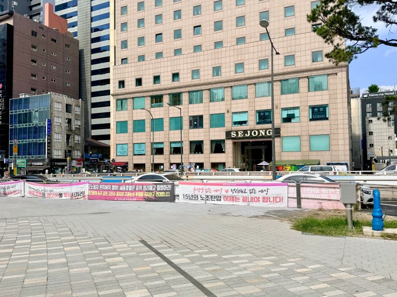 명동 세종호텔인데요 여긴 코로나 시절에 직원 분들 감축한 이후로 장사가 안된다고 응.. 그 직원 분들 복직 해야 한다고 농성 하시는 건데 농성이 한 3-4년 되셨나.. 엄청 오래 되셨어요.. 고생 많으세요.. 응..