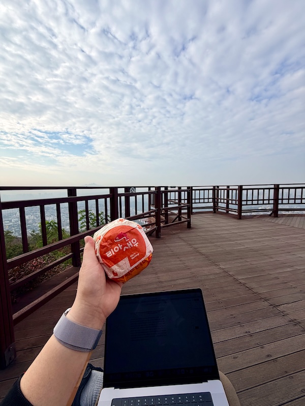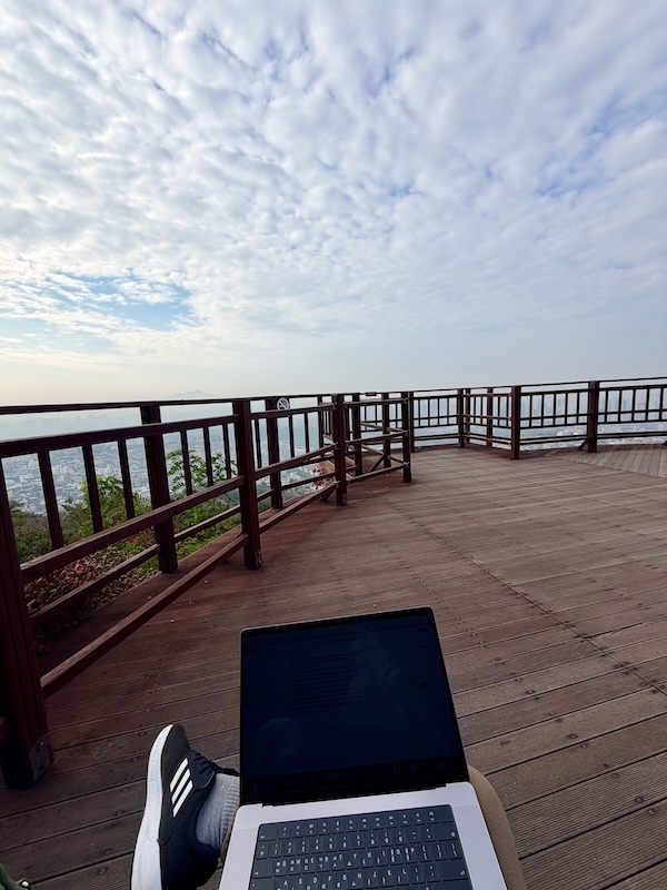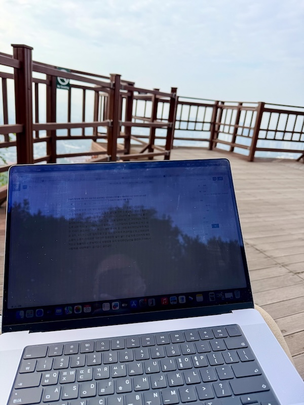 아 그런데 햇볕을 생각 못했넹.. 아 지금 오퐈 조끼 패딩 뒤집어 썼어요 응.. 아 햇볕 가을 햇볕 무시무시한데.. 얼굴 피부 노화되고 그러는뎅.. 아 완전 후아.. 아 그런데 진짜 우리둘의 사랑의 맥북 프로 특히 16인치 플래그쉽 랩탑.. 진짜.. 너무 믿음직하다.. 진심.. 응.. 이거 산 지 벌써 꽤 시간 지났는데.. 배터리가 닳지를 않어요.. 참 애플이 이런 거 하나는 잘 만드는데 문제는 호환성이 약해서 그런데 어차피 애플 기기들을 멀티로 쓰는 사람에겐 더할나위 없이 좋죠.. 응.. 애플은 랩탑, 아이폰, 기타 악세사리들 호환이 찰떡이잖아요.. 아이팟 프로도 그냥 차고 있으면 애플TV, 맥북.. 아이폰 등등 아이팟 하나로 다 이동이 가능하잖아요 응.. 그래서
