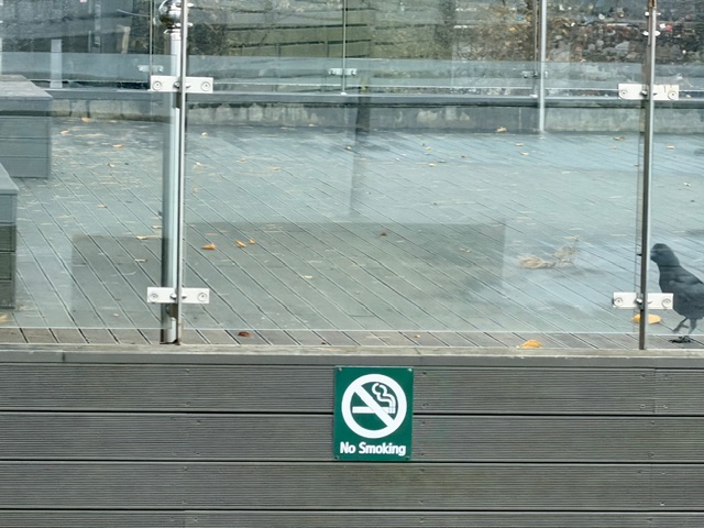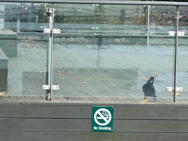 까마귀 님이 나타나신 거예요 그런데 까마귀님 포스가 크기도 엄청 크시고 천천히 그 땅콩 있는 곳으로 오시니까 잠두봉 까치 두 분이 슬그 슬금 자리를 비켜요.. 까마귀님쪽이 세력이 더 강하신가봐요 그런데 그럴만 해요 까마귀님이 크기도 더 많이 크세요 한 두 배.. 응.. 위의 사진 좌측 하단 노 스모킹이라는 표지 살짝 좌측 위에 보시면 뭔가 검은 게 살짝 보이는데 그게 까치 님 머리인데.. 이제 슬금슬금 땅콩 못 먹고 이동하더라고요