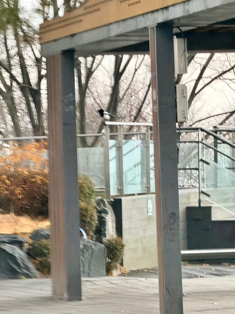 사진이 좀 흔들렸는데.. 기둥 사이 가운데 보시면 난간에 까치 님이 난간에 서있잖아요 지금 상황이 오퐈가 저 유리벽 너머에 구석 쪽에 땅콩을 부숴서 놨어요 잘 드시라고 그래서 오퐈가 자리 비켜드리니까 두 마리가 와서 먹으려는데..