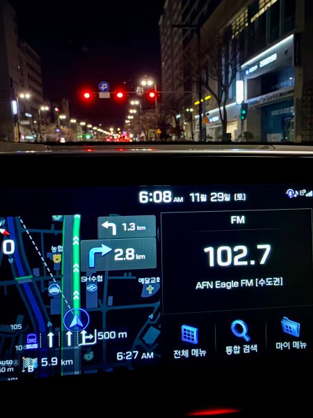 새벽에 5시 40분인가 좀 일찍 일어나서 세수하고 양치하고 옷 입고 그냥 나왔어요.. 응. 어젯밤에 살짝 마시긴 했는데 정말 적당히 조금 마신 터라 숙취도 없었고 말똥말동한 정신에.. 요즘은 차에서 102.7 어메리칸 포스 네트워크 이글 에프엠을 들어서.. 응.. 원래 오퐈 옛날부터 그랬어요.. 옛날 차 가지고 다닐 때부터.. 대학생 때부터.. 응.. 그러다 클래식 듣다가 그런데 요즘에 다시 AFN들어요