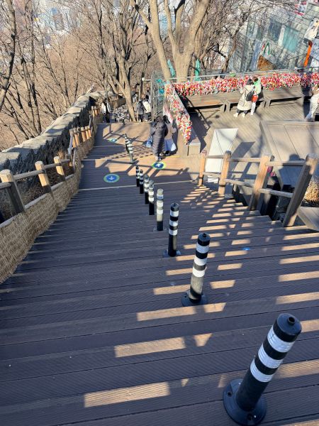 여기도 중앙 분리봉을 세웠더라고용 하루 안 간 사이에 변화가.. 인파도 많고 하니까요.. 이 계단만 보면 그 때 생각이 나는데.. 언제였나 암튼.. 그 어떤 동남아 쪽인가 암튼.. 외국인 가이드가.. 관광객 인솔 하시면서 손에는 깃발 들고.. 그 케이블카 내리는 곳에서 나와서 위 사진의 계단을 오르는데.. 그런데 남산타워에서 내려가는 사람들이 우측 보행을 안 하고 막 그냥 좌측에서 내려가고 그러니까 한국말로 “아 쥔짜 왜 우측보행을 안 하는 거야 쥔짜 아 우측으로 다니세요 우측으로” 하면서 ㅎㅎㅎㅎ!! ㅎㅎㅎㅎ;