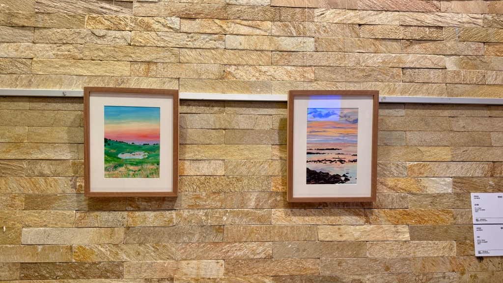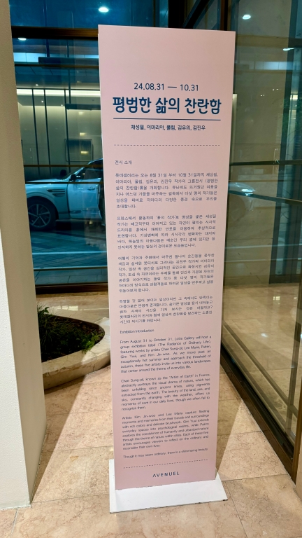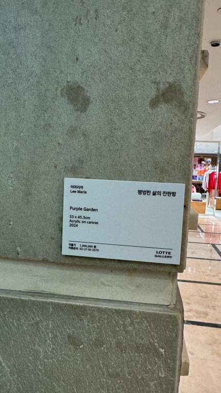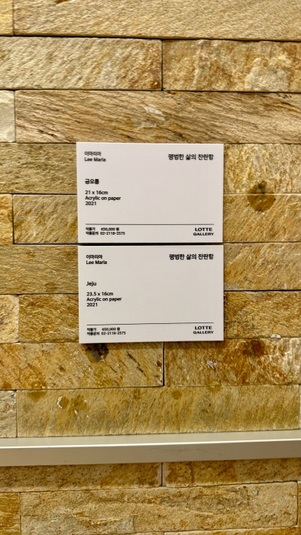 요거는 아까 그 여류 작가님께서 제주도에서 그린 작품들이더라고용 작아여.. 65만원이에여 한 작품당.. 원래 이 정도 하니까여.. 그러니까.. 보면.. 그림 시세상.. 음.. 가격 책정이.. 롯백 본점 에비뉴엘이어서 아마 가격을 20-30% 정도 높게 잡은 거 같아요 그만큼 작가님들의 비전도 본 거 같고.. 그리고 또 비싸야 사니까용.. 작품들도 상당히 괜찮아요.. 늘 보지만.. 원래 저 정도 크기는.. 이 캔버스 크기가..