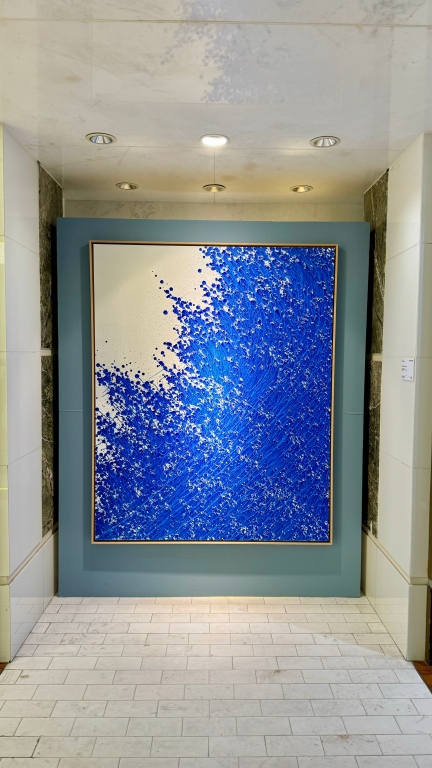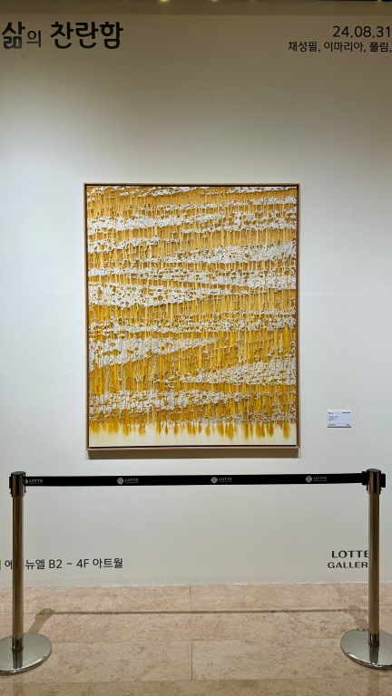 요건.. 우측엔 까르티에.. 좌측엔 샤넬 매장 그 가운데 아트 월에 있는 가장 메인 그림인데용 요건 6,500만원 이에용.. 그런데 이것도 아까 그 파란색 그림.. 그 남자분 작품인데 아.. 이것도 진짜 괜찮아요.. 집에 걸어두면.. 집이 큰 집이면 진짜 눈에 확 띄죠.. 빛이 나는 황금색이에요 위의 노란 프렉탈 구조와 비슷한 패턴이.. 보니까 유성 성분을 흐르게 두었는데.. 그 자체가 프렉탈과 흡사해용 카오스와 같으면서..