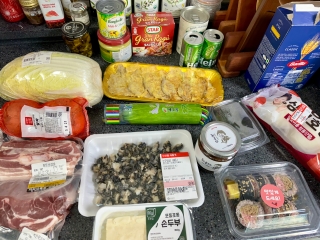 짜잔 오늘 장 본 품목들인데요.. 사진이 작아서 잘 안보이실 거 같아여.. 그런데여.. 시계 방향으로 12시 방향부터.. 롯백 본점 팝업 스토어에서 산 (이번에는 경남 특산물 특별전이었지요 늘 하던 거예용 팝업 스토어 입점은 1-2개월 텀 두고 로테이션이라)소고기 육전..