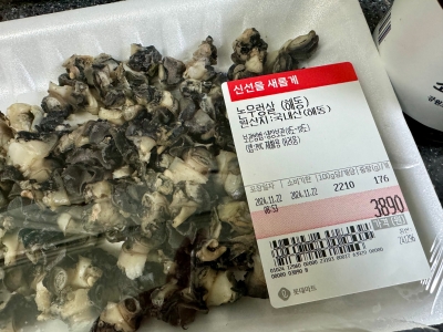 그리고 이제.. 굉장히 중요한 아이템인데요.. 일단 먼저.. 6시 방향은 손두부 오퐈가 말씀드린 그 맛있다는.. 그리고 7시 방향은 지리산 흑돼지 삼겹살과 목살.. 그리고 10시 방향 양파.. 11시 방향 알배추.. 가운데는 애호박.. 그리고 논우렁.. 그리고 논우렁 우측에는.. 매우 중요한..