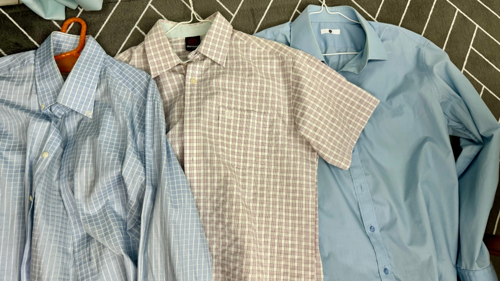 셔츠는 세 가지인데요.. 중간이 화이트 톤인데 색상이 좀 .. 아이폰이 오히려 색 보정을 조금 이상하게.. 저기 했네용.. 여튼.. 아!! 가운데 있는 셔츠가 오퐈 전에 이태원 큰 옷 가게에서 “동생한테 맞는 옷 없으니 어여 가!!” 하던 매장 옆의 큰 양복 파시던 남자 사장님이 “우리 가게에서 제일 작은 사이즈 중에 골라서 사세요” 해서 사온 셔츠 중에 하나에요 ㅎㅎㅎㅎ!! ㅎㅎㅎㅎ!! 여튼.. 이렇게..
