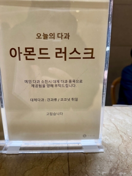 다과는 매일 바뀌더라고용 아몬드 러스크인데 아마 여기서 매일매일 이 다과 준비 만으로도 상당한 지출을 할 거 같지만 여기 올라면 본점이나 잠실이나 월드점 가려면 1년에 2,500만원 이상 쓰고.. 퍼플은 5천 만원 이상 써야 해서 여기 오는 사람 최소로 평균으로 잡아도 3,000만원 이상 쓰는 사람들이다 보니..