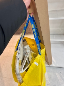 그래서 이제.. 우리둘의 사랑의 용산역에 있는 우리둘의 사랑의 용산 아이파크몰 3층에 이케아 팝업 스토어를 2월 초까지 운영하는데.. 여기서 이제 보일러실 옆방에 있는 방.. 응.. 가방 올려 둘 선반을 사려고.. 그래서 샀어용.. 이케아 매장에선 큰 카트가 있어서 밀고 다니면 되는데.. 그리고 그렇게 큰 가구는 팔진 않더라고용 응.. 여튼.. 그런데 제일 많이 팔린 선반인데.. 두 개 남았기에 이거 샀어여.. 2만 원대에용 웅..