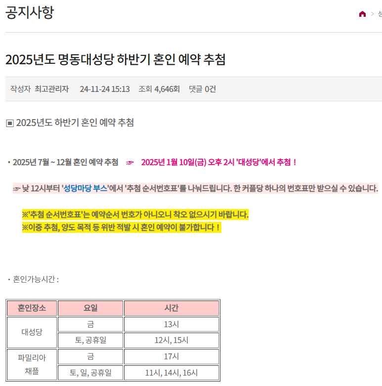 와와!! 추첨 현장 보실래요?? 추첨 사람들 많은 거 봐 와.. 대박대박.. 하긴 모든 카톨릭 예비 부부께서는 꿈의 장소이긴 하겠다 그쵸.. 명동성당이.. 응.. 아참!! 이 후기에 명동 교자 만두랑 국수 나와여 ㅎㅎㅎㅎ!! ㅎㅎㅎㅎ!! 야무지게도 구경하셨네 ㅎㅎㅎㅎ!! ㅎㅎㅎㅎ; 아잉 우리주인님 음식 후기 조심조심 굽신굽신 굽신굽신.. 아잉 우리주인님 사랑해용 사랑해용!!!! 굽신굽신 굽신굽신.. <명동성당 2025년 추첨 성공 후기>