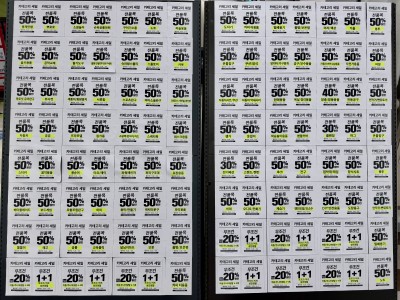 위의 사진은요.. 전부다 어떤 품목이 50%인지.. 어떤 품목이 1+1인지 쭈욱 붙여둔 건데요 홈플 매장 게이트 앞에 저렇게 쫘악.. 응..