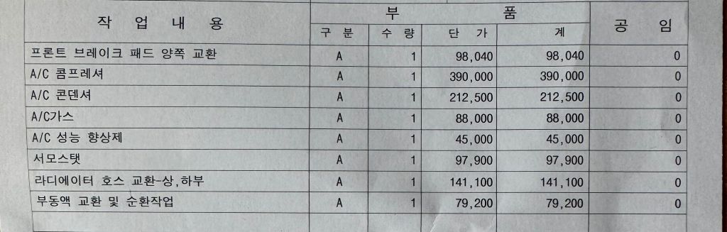요게 바로 오늘 오퐈 붕붕이 수리한 내역인데요.. 헐.. 그러니까 7년간 아무 사고도 없이 아무 탈도 없이 겨우 4만7천 km정도 달린.. 차인데도 7년이 지나니까 부속품들이 슬슬 교체가 되어야 하는지.. 응.. 일단.. 프론트 브레이크 패드는 말그대로 전면부 패드.. 응.. 그거 교체.. 다 정품이에요.. 아!! 에어컨 컴프레셔만 정품 아니당.. 응..