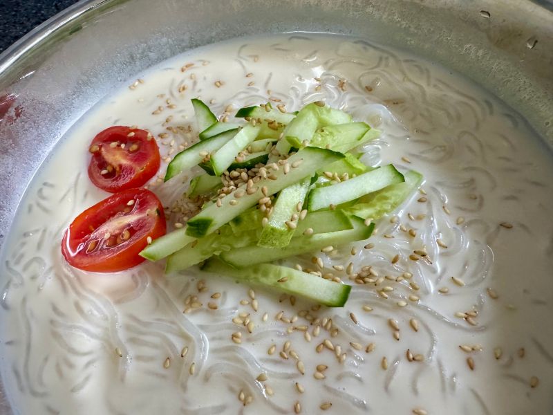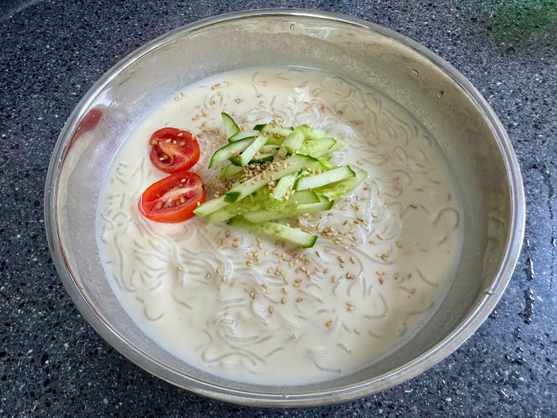 그러니 얼마나 드실 게 없으시고 하셨으면 어떻게 보면 되게 가슴 아픈 한국 역사인데.. 그런데 지금은 이렇게 풍족하게 살고 있으니.. 아.. 배고프다.. 아.. 아!! 아참.. 보여드릴까여?? 콩국수인데 그.. 저기.. 아!! 곤약.. 응 실곤약.. 곤약면으로 만든 콩국수.. 응.. 진심 맛있어여.. 그런데.. 되게 헛헛해요 실곤약으로 면을 대신하면.. 되게 헛헛하고 헛배 부른 거 같고.. 곤약이 칼로리 0에 탄수화물이 없으니까.. 그래서 국수를 조금만 끓여서 같이 먹는데.. 그럼 좀 나아요.. 이렇게 먹고 운동 별로 안 했는데도 살이 빠졌어여.. 응..