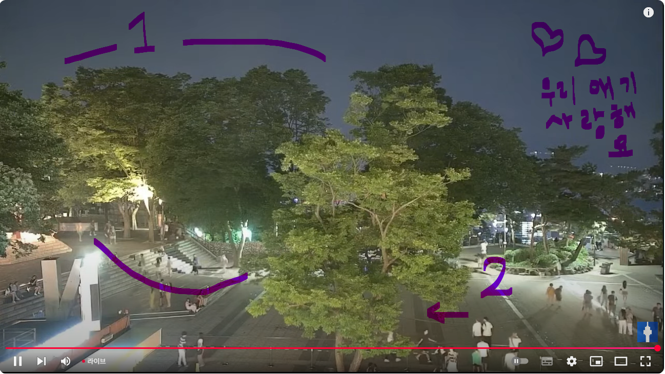1번 구역의 나무들이 오퐈가 말씀 드린.. 응.. 대왕님이 느껴지는 지역이고요.. 옛 국사당 터가 1번 구역 앞쪽으로.. 아.. 사진 사응로 ㄴ뒤쪽에 있으니까요.. 그리고 2번이 앞 나무인데.. 2번은 잘 흔들려요 바람에.. 1번 구역은 바람이 불어도 멈춰 있는 거예요.. 그런데 가끔 실시간 채널을 보면 1번 구역 나무들은 정말 원래 잘 안 흔들거리긴 한데.. 늘.. 보면 흔들어 주셨다고 해야 할까요 암튼 바람에 나뭇가지가 나뭇잎이 흔들렸는데.. <YTN서울타워 파노라마 LIVE : 유튜브 실시간 영상>