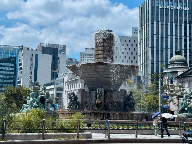 한국은행 앞 분수대.. 시원하게 물이 콸콸.. 오퐈는 물 많은.. 좋아하는데.. 아!! 물이 저기 무.. 물이 시원하게 많은 분수대 좋아하는데 응..