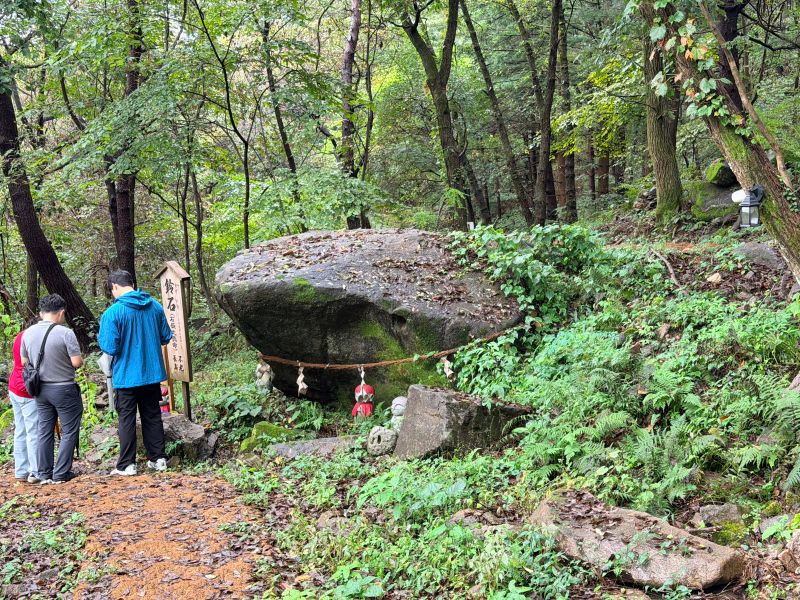 그런데 그걸 일곱 곳이나 만들었어요..; ㅎㅎㅎㅎ!! ㅎㅎㅎㅎ; 대단히 위험한 지역인데.. 그런 쪽으로 본다면.. 응.. 문제는 위의 저 돌 모양.. 큰 바위.. 원래 부터 산에 큰 바위는 신이 깃들거든요.. 원래부터 지역 마을 주민들이 산신을 모실 때 큰 바위에 대고 빌거나 그랬어요.. 그런데 저 바위가.. 좀.. 응.. 저 곳이 약간 산인데.. 곳곳에 일본에서 가져온 석상인지 아이 모양의 석상들이 곳곳에 배치 되어 있어요.. 그리고 저 바위에 일본식으로 밧줄을 감고 일본 신을 두었다니..