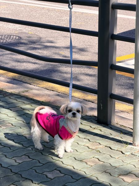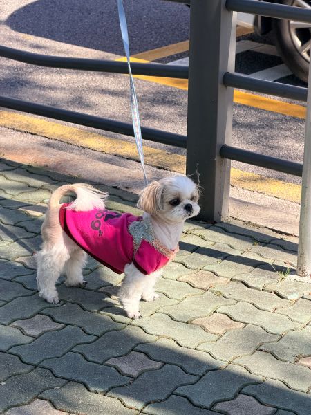 ㅎㅎㅎㅎ; ㅎㅎㅎㅎ; 그래도 애가 분리불안은 없는 거 같아서.. 응.. 그런데 멍뭉이 옷 입은 거 보면 아주머니나 할머니 취향이신 거 같은데.. 비비드한 색상에.. 핫핑크.. 반짝이는 옷.. ㅎㅎㅎㅎ; ㅎㅎㅎㅎ; 어딜 거셨기에 애를 묶어 두시고.. 응..