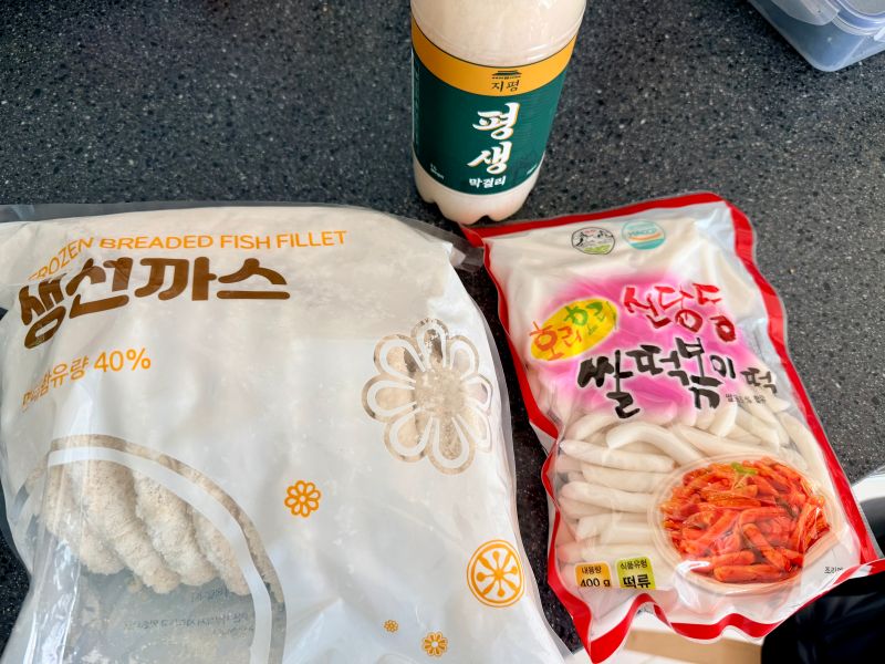 아까 마트에서 플렉스한 건데요.. 지평생 생막걸리.. 990원.. 대박이죠.. 안 살 수가 없더라고요.. 편의점에선 두 배 가격인데.. 거기에 오퐈 떡볶이 해먹으려고.. 언젠간 해 먹고 말리라.. 하면서.. 그래서 신당동 떡볶이 식 얇은 떡 있죠.. 그거 3천 원.. 그리고 옆에 생선까스가 대박..