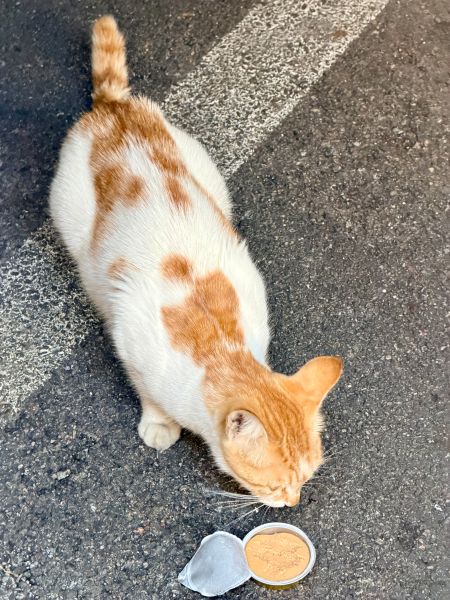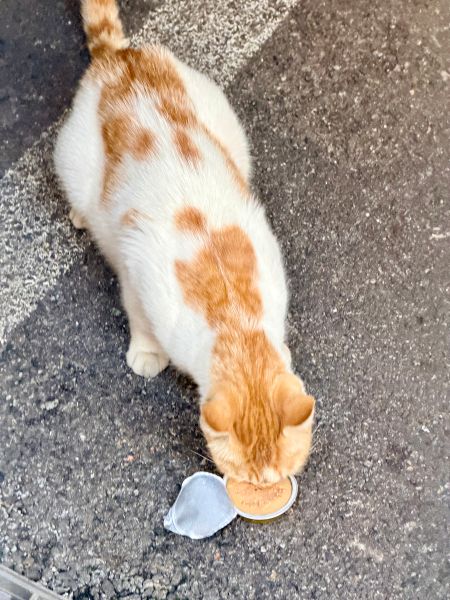 얘가 오퐈가 벽에 그.. 락카칠 하려고 태이핑 작업 하는데 그 벽의 담벼락에 앉아서 오퐈를 가만~~히 봐요.. 오퐈가 캔 주는 사람인 걸 아는지.. 뭔가 기다리는 눈치라.. 그래서 혹시.. 하고는 성급히 이제 차 키 가지고 나와서 트렁크에서 냥냥이 맘마 꺼내서 놔주니까 얘가 오퐈 눈치 슬슬 보면서 아직은 경계를 하면서.. 그런데 오퐈가 “응 괜찮아 어여 먹어 응 괜찮아” 하면서.. 그랬더니 얘가 되게 배고팠는지 되게 맛있게 먹는데..