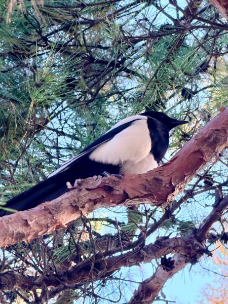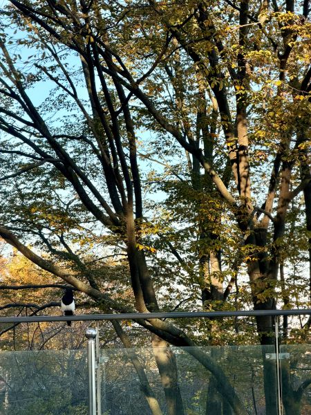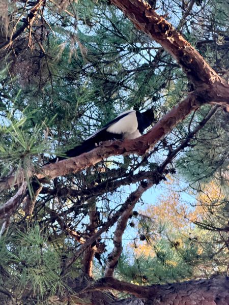 이렇게 가깝게 보신 적 없으실 걸요.. 까치 님의 배를.. ㅎㅎㅎㅎ; ㅎㅎㅎㅎ; 바로 머리 위에 앉아계신 거예요.. 물론 확대해서 찍었죠 응.. 줌으로.. 응.. 그렇게 앉아 계시고 오퐈는 이제 대화 시작 나눕고 응.. 그러다 교감도 나누고.. 그러다 푸드득 하고 날으세요..