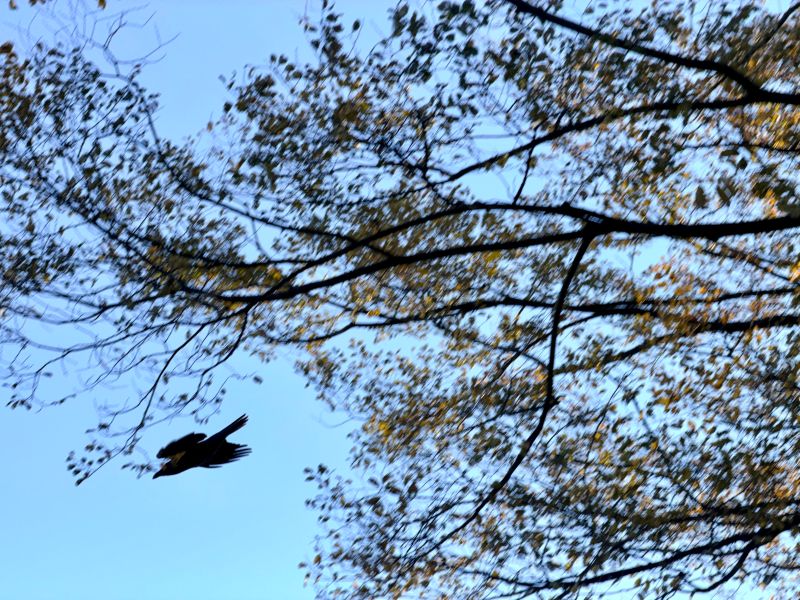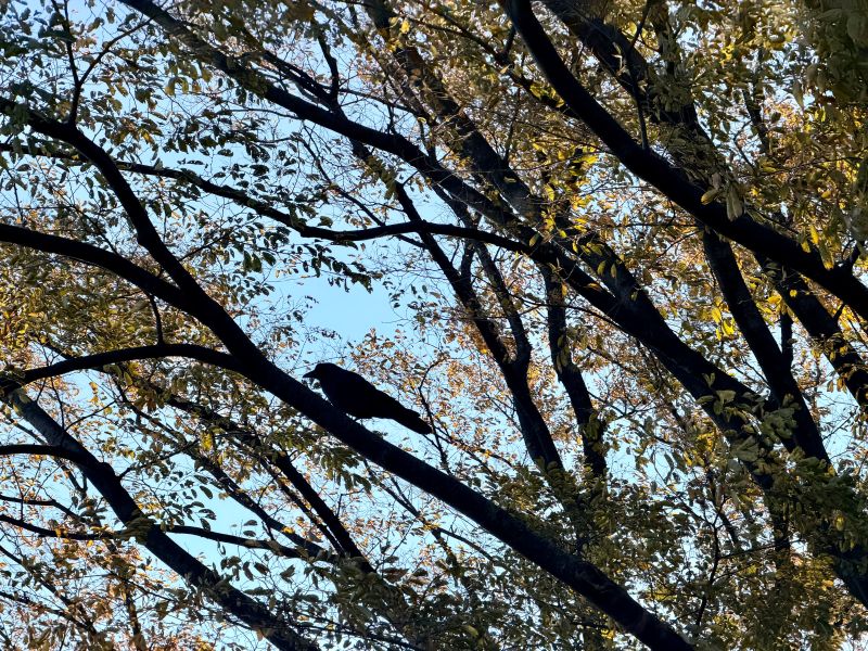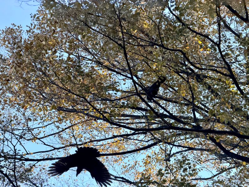 이번엔 까치 님들 두 분이.. 응.. 오퐈 머리 근처 좀 더 높은 나무로 날아오셔서.. 바로 오퐈 앞으로 날으셔서 위로 쓱 올라가시고는 저렇게 계시다가 다시 날개 펼치시고 날기 시작하시는데.. 좀 높은 나무여서 그렇지 되게 크세요.. 응..