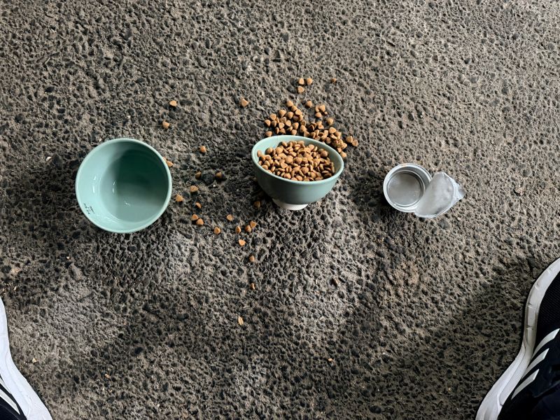 이 고양이 엄청 응.. 오퐈가 오퐈 차 주차하는 곳 밑에.. 이렇게 물도 새로 갈아주고.. 맨 좌측이 물이고요.. 밥도 넉넉하게 건식?? 사료 넉넉히 주고.. 그런데 맨 우측의 습식?? 여튼 그거.. 응.. 작은 캔.. 저걸 한동안 안 줬어요.. 그런데 요즘에 얘네가 저 건식 밥을 잘 안 먹어요.. 왜냐면.. 그게..