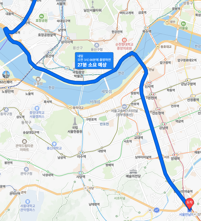 맞네.. 응.. 27분 소요라고 나오지만 사실 정속도 지키면서 가는 평균 시간을 낸 것이고.. 조금 빠르게 간 다든지 하면 더 빨리 가죠.. 물론 오퐈는 정속을 지키려 하는 사람이고요.. 그래서 우리 어릴 때 보면 예전에 “총알 택시”라고.. 지금 아이들은 상상도 못 하죠.. “서울에서 빨리 달리는 택시요??” 하고.. 그런데 우리 때는 있었잖아요..