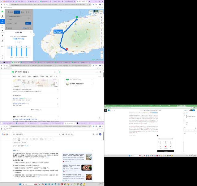 지금 위의 스샷이 아까 오퐈가 검색하던 자료인데요.. 좌측은 새로로 쓰고 있는 4K모니터고 우측은 윈도우 랩탑 모니터인데요 오퐈는 어쩔 수 없나봐요.. T는 T라서.. ENTJ들 그 성향은 응.. 그냥 자연스럽게 찾아보며 쓰려고 했는데 어쩌다 보니 거리 계산 부터 해서 다 찾고 있더라고요.. ㅎㅎㅎㅎ!! ㅎㅎㅎㅎ; 그런데 일단..