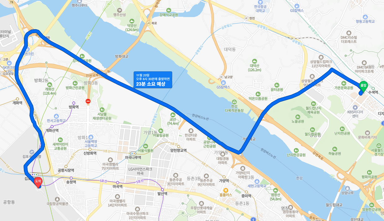김포 공항 국내선에 한 8시 40분 까지는 도착해야 하는데요.. 그런데.. 사실 가능은 해요.. 문제는 우리아가님을 오퐈가 몇 시에 픽업 하느냐의 문제가 있어서요.. 일단 가능은 해요.. 상암동에서 김포공항 국내선까지는 평일(목요일) 오후 8시 정도의 기준으로 보면 그런데 왜 목요일로 잡았냐면 금요일만 버티시면 주말이니까요.. 그런데 금요일로 잡으면 사람 엄청 많아지고 티켓팅도 힘들고 응.. 목요일에 가셔야 그 짧은 꿀맛이 더 짜릿하게 ㅎㅎㅎㅎ;