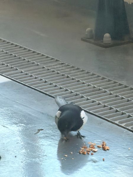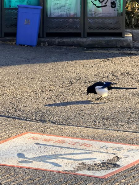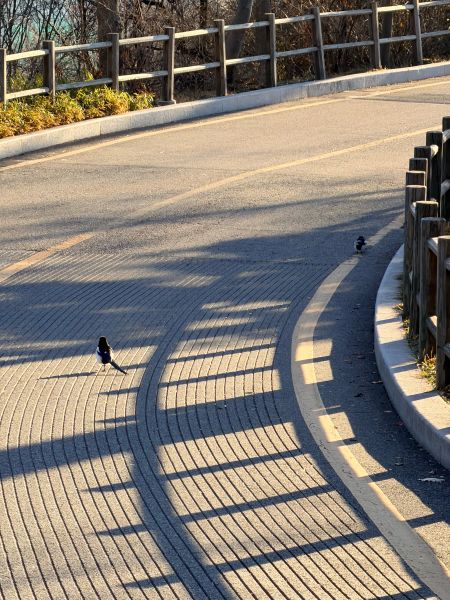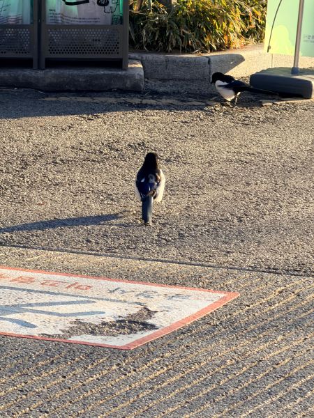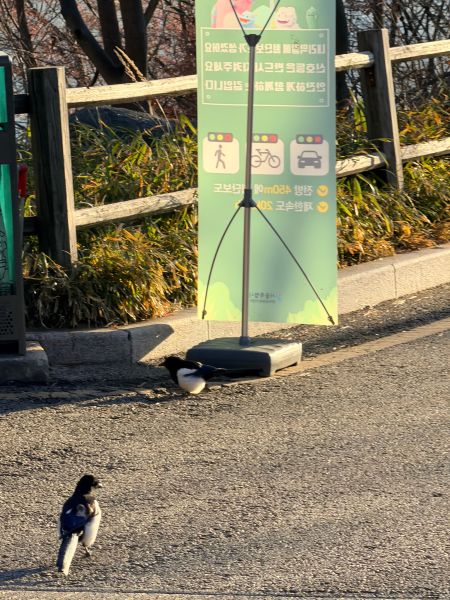 버스 안에서 지나면서 보는데.. 오퐈가 땅콩을 놓았던 자리 건너편의 나무에 까치 커플이 더 위에 앉아있고 까마귀 두 마리가 땅콩과 더 가까운 근처에 앉아있더라고요.. 즉.. [까치 커플] == [까마귀 두 마리] == [땅콩] 이렇게.. 그래서 오퐈가 아몬드를 놓아두면 까마귀 님들이 미리 가서 먹는 거 같아요 덩치가 두 배나 더 큰 까마귀들이 선점 하는 거죠.. 그래서 결국 이 근처에선 까마귀 님들이 눈치 다 챘고 그래서 까치 커플은 못 먹으니까 오퐈를 따라다니는 거 같아요.. “우리 못 먹었으니 내놔” 이러고.. 그래서 아까