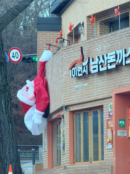 오퐈네 부모님 집에 가는 중이에용.. 밥 먹으려고 어머니 밥 생각이 나서.. 응.. 그런데 남산 돈까스벽면에 산타클로스가 며칠 전만해도 빵빵 했는데.. 공기 온도가 확 낮아지니까 공기가 수축하니까 산타 클로스 풍선??도 쪼그라 들었어요..; ㅎㅎㅎㅎ ㅎㅎㅎㅎ 그런데 위의 남산돈까스는 김포공항 롯데 쇼핑몰에도 있더라고요.. 응..