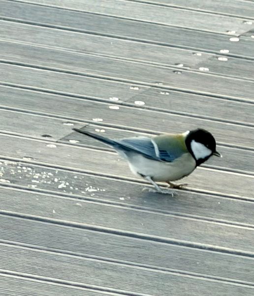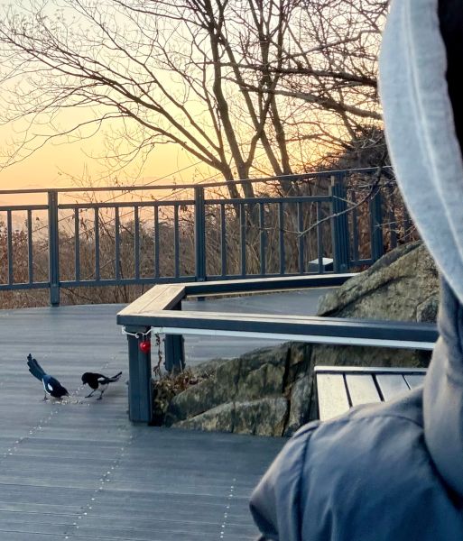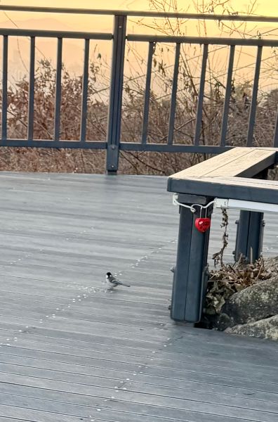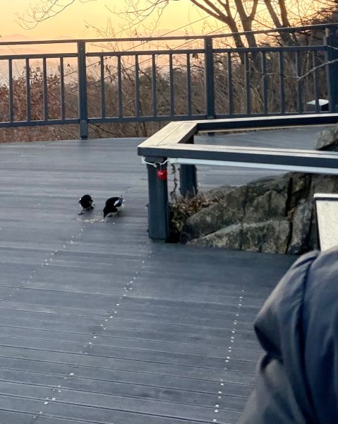 요고 귀한 사진이죠.. 잠두봉 커플들이.. 밥 먹는 사진.. 얘들이 야생의 새라서.. 오퐈가 곁에 있으면 안 먹는데.. 일부로 좀 거리가 있는 곳에 아몬드 좀 작게 뽀사서 놓고.. 오퐈가 일부로 뒤돌아서 오퐈도 삼각김밥 먹으면서.. 응.. 모르는 척~~ 하면서.. 등 보이면서.. 그랬더니 잠시 후에 저 데크.. 나무 데크 바닥을 톡톡 톡톡 하고 부리로 탁탁 치는 소리가 작게 나서.. 핸드폰으로 셀카 모드로 해서 오퐈 어깨 너머로 찍은 거예요..