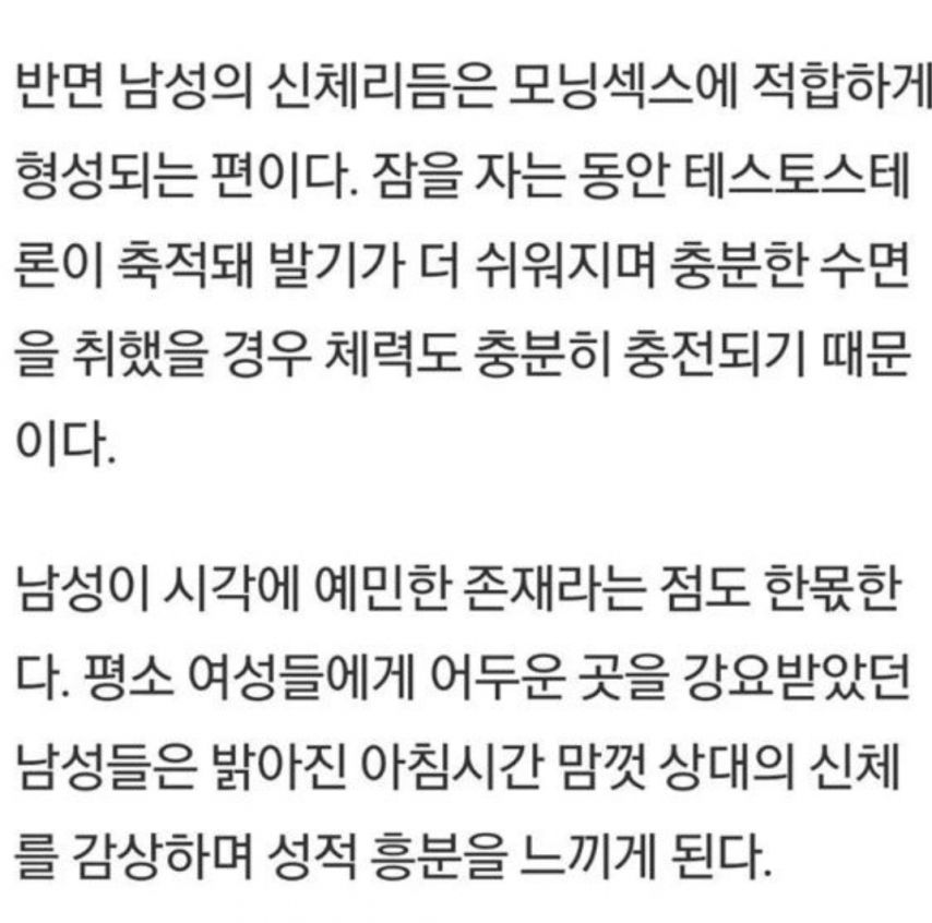 우아..그렇다고 하더라고용 그런데 시각에 예민한 존재인 것은 확실한 거 같아요.. 아침에 발기가 더 쉬워지는 것도 오퐌 아예 발기가 유지된 상태로 일어나기도 하고 그래여..; 아.. 아공..; 암튼.. 뭐더라.. 응.. 남자는 시각에 예민하다는 것은 확실해용 완전.. 완전 공감.. 오퐈 지금도 우리주인님 움짤 보면서 흥분 하잖아여.. 물론 눈을 감고 우리주인님을 상상하기도 하지만 뭔가 흥분의 촉매제의 역할은 우리주인님의 움짤이라든지.. 그런 면에서 뭔가 더.. 저기.. 자극을 받고 하다보니까용 아잉 우리주인님 사랑해용 사랑해용!!!! 굽신굽신 굽신굽신..