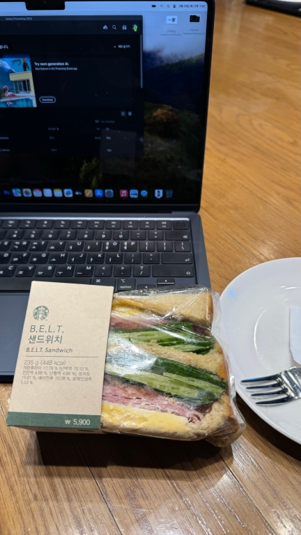 우리둘의 사랑의 용산 아이파크몰 안에 있는 스벅에서..처음엔 니뽕 내뽕 짬뽕 먹을까 하다가.. 운동량이 많지 않을 거 같아서요.. 그냥 가볍게 샌드위치에 아아 한 잔 해야겠다 하고는.. 처음엔 못 먹어본 요즘 새로 나왔다는 포크 그거 샌드위치.. ㅎㅎㅎㅎ; ㅎㅎㅎ; 폴드 포크 샌드위치.. 그게 원래.. 폴드 포크가.. 장시간 돼지고기를 훈제 바베큐를 해서 그걸 잘게 찢어서 그.. 스테이크 소스였나 여튼 소스에 잘 무쳐서 먹는 거잖아요.. 원래 미국식 바베큐에 있는 레시피고용.. 미국 사람들 특히 바베큐 좋아하는 텍사스 쪽은.. 그들이 바베큐 파티를 하면 햄버거를 만들든 아니면 폴드 포크를 만들어서 그걸 번에 싸서 먹잖아요.. 그 스매쉬 한 포테이토 그거랑.. 저기 뭐얌.. 아잉 ㅎㅎㅎㅎ!! ㅎㅎㅎㅎ; 그래서 그걸 먹을까 하다가.. 칼로리가.. 여튼 BELT는 워낙.. 클래식이니까요..