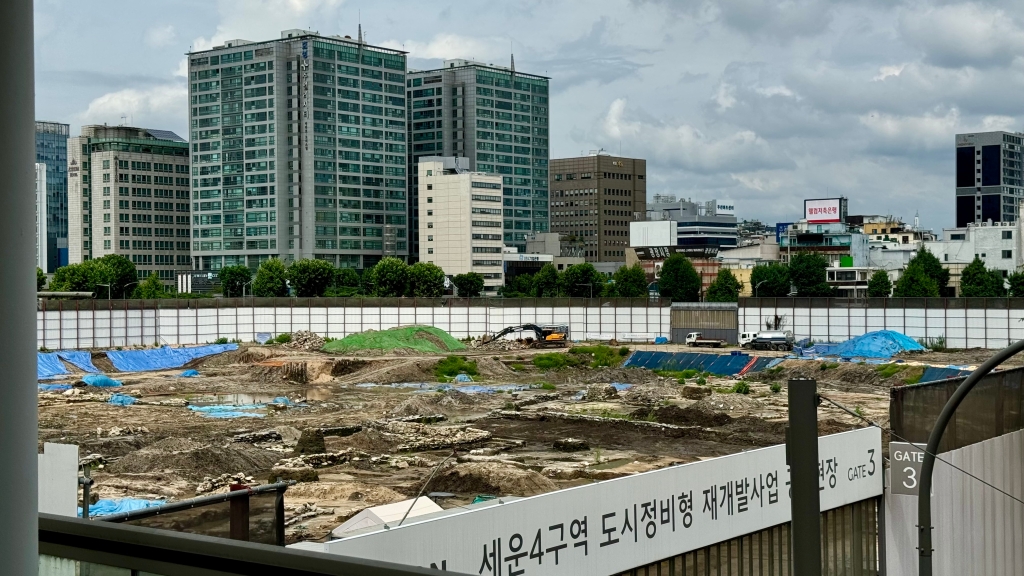 세운상가 옆에.. 이 4구역 도시 정비형 사업이.. 꽤 오랜 시간 준비 된 사업인데요.. 여기가 이 위로 전부 다.. 3-4층 정도 되는 혹은 단층의 1950년대?? 그 때부터 지어졌던 건물들이 빼곡했고 그 건물들이 다 액세서리 만드는 공장이었는데.. 우리나라 엑세서리 만드는 공장이 중국한테 밀려서 대부분이 비어있었어요.. 여튼 그래서 재개발을 하는데.. 지금 여기가 가림막 쳐있고 세운상가 옥상에 우리주인님 업무 하셨던 장소 있죠 우리주인님 큰큰 대대 빅빅 특급 엄청엄청 럭셔리 화려하신 업무인 완전 공익 광고 촬영 하셨던 곳..