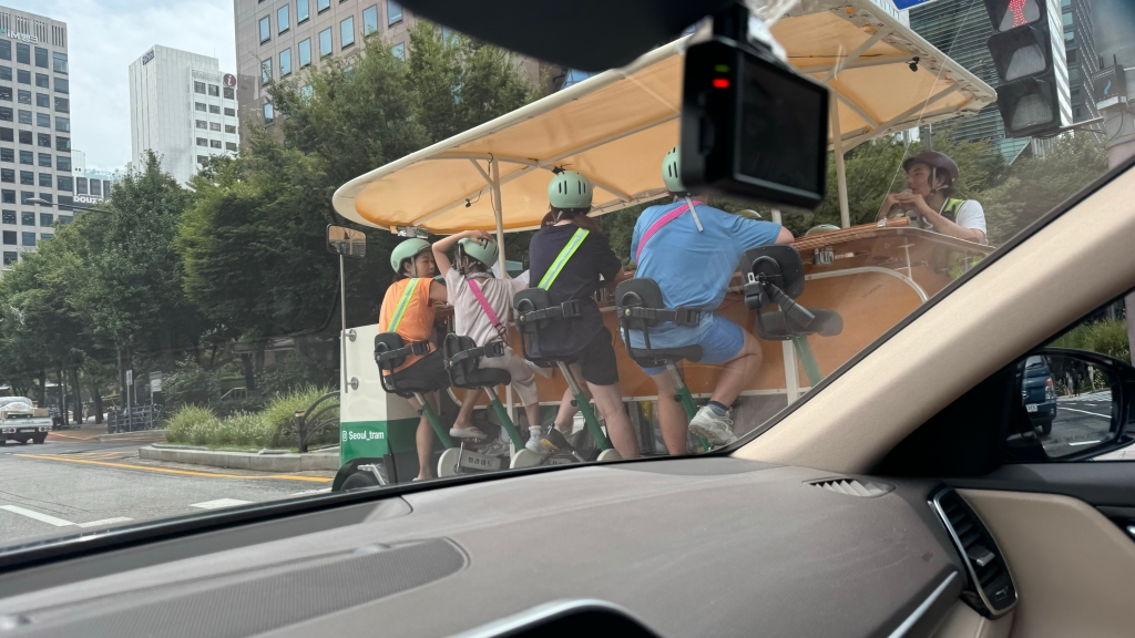 그런데 이 더운 날씨에.. 서울 관광 오신 분들 같은데용 이 분들도 하필 이렇게 더울 때에.. 트램 관광 예약 하셨나 봐요.. 저렇게 페달을 돌리면 앞으로 가는 그런 건데요 진짜 아주 가아~~끔 보여요.. 저거 말고 예전엔 말도 있었는데 마차..말이 가다가 똥 쌀 까봐 대변 받는 그런 게 마차에 마련 되어 있고.. 그리고 그..인력거도 있어요..인력거는 가끔 종종 보여요.. 위의 트램은 진짜 희박하고 인력거는 그나마 가끔.. ㅎㅎㅎㅎ; 아잉 우리주인님 사랑해용 사랑해용!!!! 굽신굽신 굽신굽신..