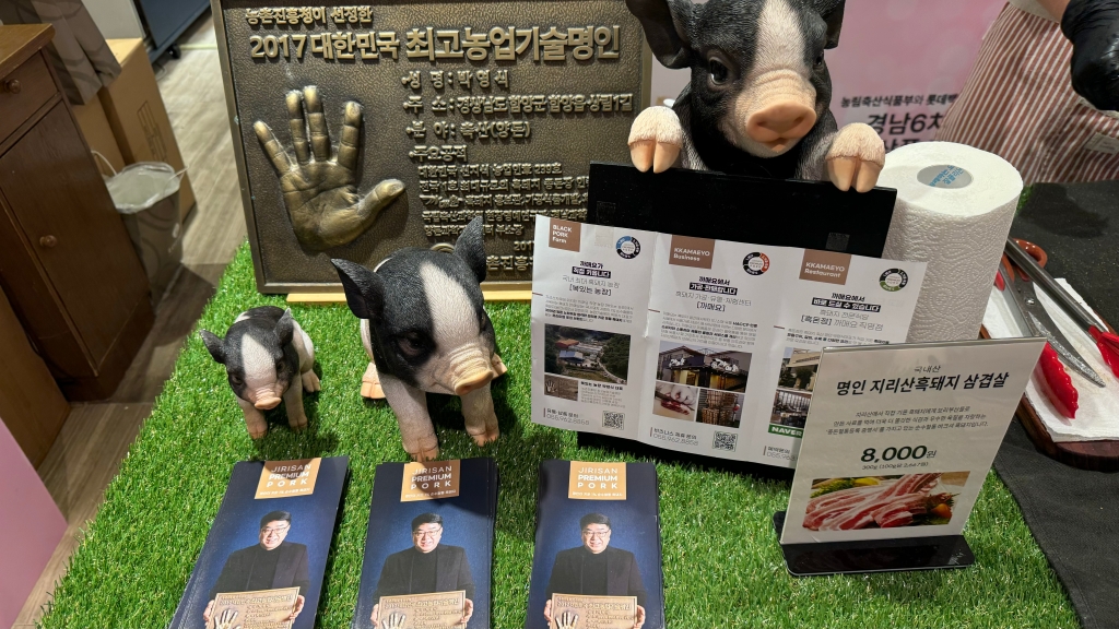 롯백 본점 팝업 행사 경남 뭐시기.. 행사가 어제가 마지막 날이었는데 롯백 본점 팝업은 목요일에 종료 하고 금요일에 새 오픈 하거든요.. 입점 업체에 따라 2주 동안 하는 곳도 있고 보통은 일주일 간 해용.. 그런데 지리산 흑돼지 명인이 키운 버크셔 품질의 흑돼지라는데.. 보시면 8,000원 써있잖아요.. 그런데 냉동 보관중이었는데 냉동 매대에 5,000원 8,000원 이렇게 써있어서..오퐈가.. 팝업 직원 분에게 “저기요 이거 100그램에 5천 원이에요??” 했더니 그 분이 “아뇨!! 한 팩에 5천 원입니다” 하면서.. 그 분도 놀라고 오퐈도 놀라고 왜냐면.. 한 팩에 300그램 이상이던데.. 오퐈 롯백 본점에 제주 흑돈 파는 매장.. 거기서 제주 흑돈 오겹살을 100그램에 8천 원 넘게 주고 사 먹는데.. 물론 15% 디스카운트 해주지만..