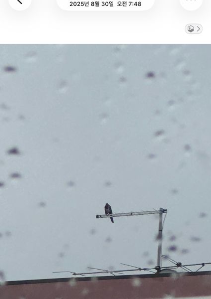 그런데 저 위치는 전에 오퐈를 바라보던 장소에요.. 오퐈네 거실 정면에 있는 건너편 건물의 옥상에서.. 그런데 위의 사진도 오퐈도 참 뭔가를 느낀 것인지.. 비가 오던 8월말의 어느 날 아침인데.. 창밖을 보니 오퐈네 집을 내려다 보는 거 같은 까치 한 마리가.. 응.. 얼마나 힘들었을까.. 5월에 성채가 되어서.. 8월 말까지 4개월 여간의 그 생존을 위한 몸부림은.. 제대로 먹지도 못해서 그 까마귀들 텃새 사이에서 얼마나 고생했을까.. 그런데 넌 왜 그리 나를 보는 거니.. 대체 전생에 무슨 인연이었니.. 전생은 있기는 한 걸까..